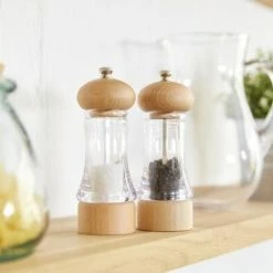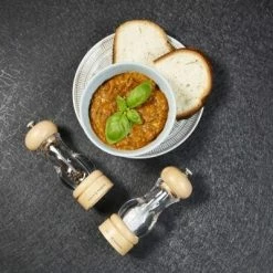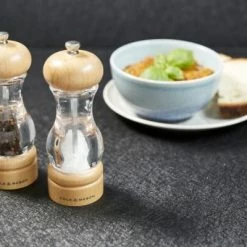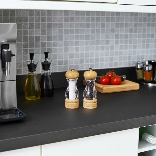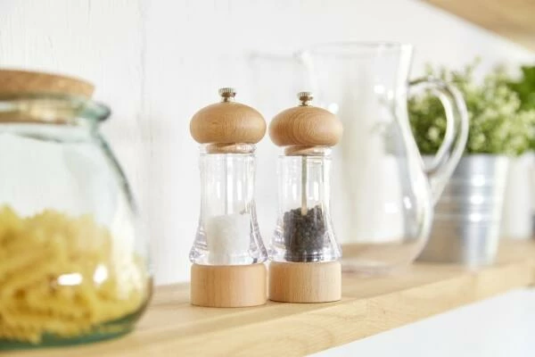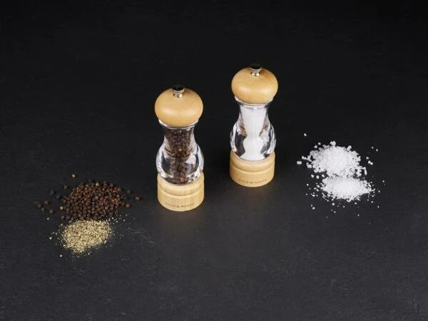 Ein klassisches Set aus Salz- und Pfeffermühle aus Acryl und Buche. Damit die natürliche Schönheit der Holzmaserung durchscheinen kann, wurde die Buche mit einem Klarlack veredelt. Die Pfeffermühle wird mit einem Mechanismus aus Karbonstahl geliefert, der Pfefferkörner eher streift als zerkleinert, wodurch bei jeder Umdrehung mehr Geschmack freigesetzt wird. Die Salzmühle ist mit einem diamantscharfen Keramikmechanismus ausgestattet, der bei jedem Gebrauch für eine genaue Würze sorgt. Verwenden Sie den Drehknopf an der Oberseite der Mühlen, um den Mahlgrad von fein bis grob einzustellen. Grob ist ideal für Steaks, mittel für Pizza und fein für Suppen und Saucen. Beide Mühlen werden teilweise mit hochwertigen vietnamesischen schwarzen Pfefferkörnern und belgischem grobem Meersalz gefüllt und sind somit sofort einsatzbereit.