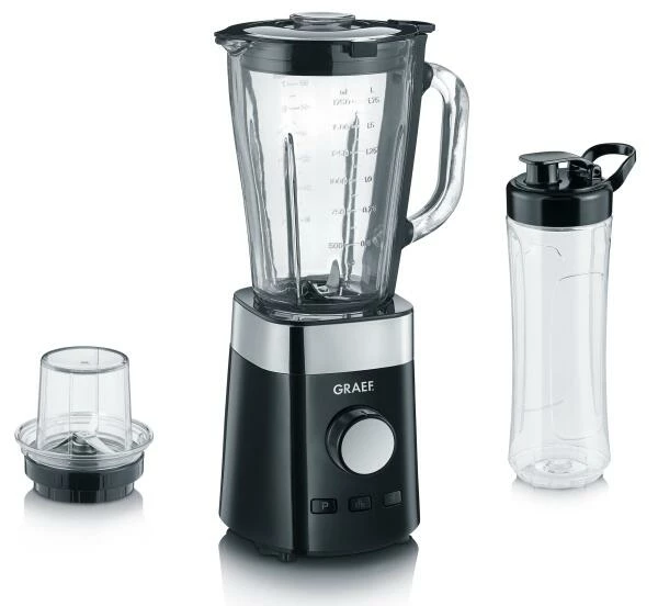 Das besonders scharfe, 4-flüglige Edelstahlmesser ist zur Reinigung abnehmbar. Der GRAEF Standmixer wird inklusive einer 600 ml Trinkflasche für unterwegs und einem 200 ml Behälter zum Zerkleinern von Lebensmitteln oder Mahlen von Kaffee geliefert.