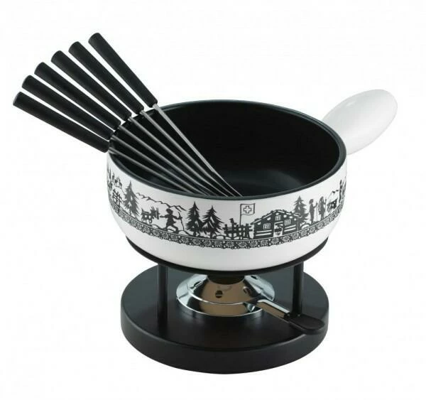 Der Caquelon hat ein bezauberndes Design. Weiß grundiert wird die Schweizer Alpweide als Scherenschnitt dargestellt. Das außergewöhnliche Muster macht Ihr Fondue zu einem Gaumen- und Augenschmaus.