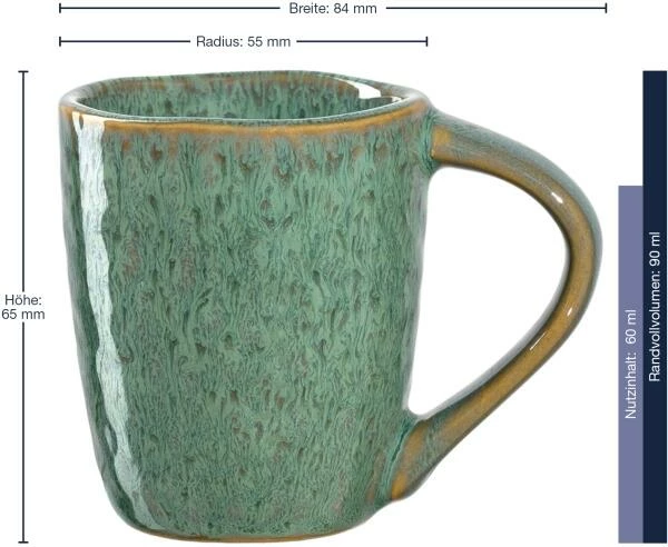 Erleben Sie italienischen Charme bei sich zu Hause und lassen Sie sich mitreißen von der Tasse aus der Serie MATERA. Diese Tasse ist ein absolutes Must-Have und überzeugt mit ihrem modernen grünen Farbton. Mix und Match, die Produkte und Farben sind miteinander kombinierbar. Durch die handaufgetragene Effektglasur ergeben sich einzigartige Farbverläufe und individuelle Muster. Dennoch passen alle Stücke harmonisch zusammen. Das Geschirr ist schnittfest, mikrowellengeeignet und spülmaschinenfest und zudem noch ideal geeignet für schicke Dekorationen. MATERA ist ideal für den gedeckten Tisch – ob morgens, mittags oder abends, ob für Heißgetränke oder die Zubereitung und das Genießen von Speisen. Am besten nicht mehr lange zögern! Kommen auch Sie in den Genuss dieser wunderschönen grünen Espressotasse!