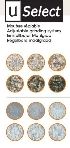 Das neue patentierte u´Select System von PEUGEOT ermöglicht eine leichte Einstellung des gewünschten Mahlgrades mit höchster Genauigkeit. Es genügt, den Edelstahlring am Fuß der PEUGEOT Mühle zu drehen und eine der 6 Positionen auszuwählen.