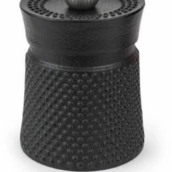 Ein Material der besonderen Art: Gusseisen. Wird es doch traditionell für die Herstellung von Teekannen verwendet, erfindet es sich nun im Bali Tempel der Gewürze neu. Auf dem Bambustablett in warmen Farbtönen stehen zwei prächtige Objekte aus schwarzem Gusseisen: Eine 8 cm große Pfeffermühle und ein Salzschälchen mit Deckel samt zierlichem Bambuslöffel, zur besseren Dosierung des Salzes.