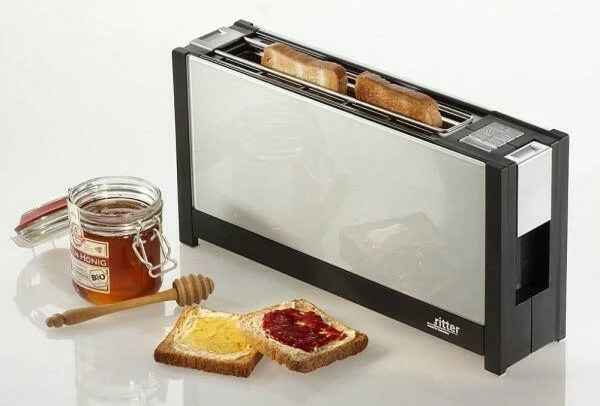 Mit nur knappen 9 cm Breite ist der elegante Toaster volcano5 von ritter unvergleichbar schmal und natürlich „made in Germany“. Er ist mit edlen Glasfronten in schwarz, weiß und rot erhältlich. Der Langschlitztoaster volcano5 röstet zwei Scheiben gleichzeitig und verfügt über eine automatische Röstgutzentrierung, eine Auftau- und Aufwärmfunktion sowie eine integrierte Brötchenauflage und ein Krümelfach. Der Röstgrad wird digital über LED’s angezeigt. Das wärmeisolierte Gehäuse, die automatische Abschaltung bei Klemmen des Toastes, eine separate Stopptaste zum Unterbrechen des Toastvorgangs und die manuelle Nachhebefunktion gewährleisten absolut sicheres Toasten.