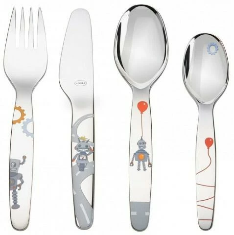 Das Set besteht aus einer Kindergabel, einem Kindermesser, einem großen Kinderlöffel und einem kleinen Kinderlöffel mit freundlichem Roboter Design.