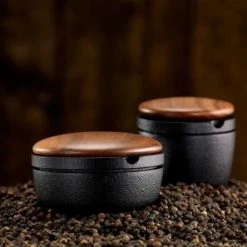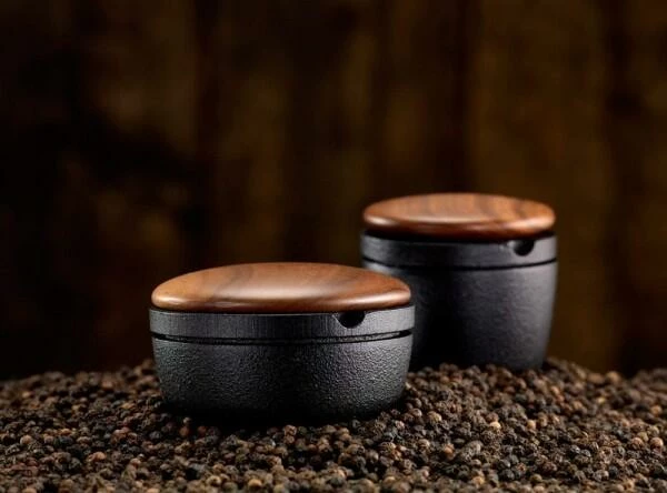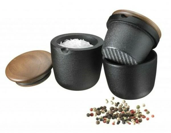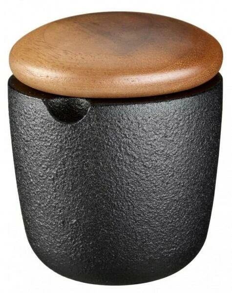 Skeppshult Salzbehälter Kleiner Swing in walnuss. Die gusseiserne Kräuter- und Salzschale mit einem Deckel aus edlem Walnussholz.