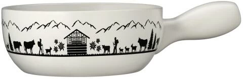 Spring Fondue Caquelon Montana in weiß/schwarz. Fondue Caquelon mit idyllischen Alpenmotiven.
