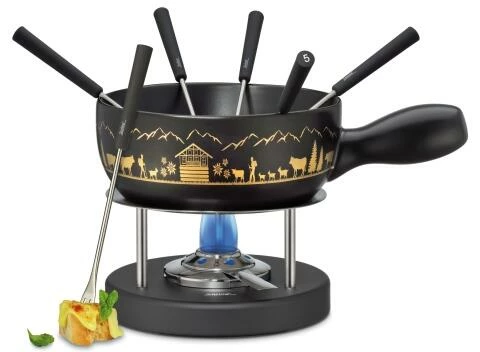 Spring Käsefondue-Set Montana. Käsefondue-Set mit idyllischem Alpenmotiv auf dem Caquelon.
