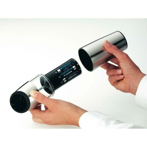 WMF Elektrische Kippmühle. Pfeffermühle und Salzstreuer im modernen Edelstahl-Design. Nicht nur modern, sondern auch selbstständig. Das Mahlwerk schaltet sich automatisch ein und aus, wenn die Mühle geneigt wird – wie wenn man eine Flasche entleert. Komfortabel haben Sie dabei immer eine Hand frei.