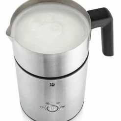 Mit seiner 650 Watt Leistung erreicht das Gerät t für heiße Milch eine Kapazität von 150 bis zu 500ml, bei Milchschaum eine Kapazität von 150 bis zu 350ml. Die Abschaltautomatik sorgt für Sicherheit beim Benutzen. Zudem verfügt das Gerät über eine LED-beleuchtete Taste mit WMF One Touch Funktion. Das Ausgießen des zubereiteten Getränks wird durch der schön geformten Schnaupe zum tropffreien Erlebnis. Nach der Nutzung kann der Milchbehälter in der Spülmaschine gereinigt werden.