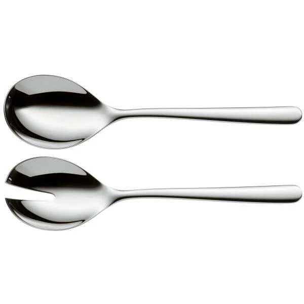 WMF Salatbesteck Kult. Durchmischen, aufgreifen, servieren: Keine Frage, zu einem frischen Salat gehört ein Salatbesteck. Es ist stets zweiteilig, wobei seine flachen, äußerst großzügig gestalteten Laffen die leichte Aufnahme des Salats ermöglichen und zwar so, dass überschüssiges Dressing vor dem Servieren leicht abtropfen kann. Die langen Stiele des Bestecks sorgen für bequemes Hantieren und verhindern zugleich, dass es in die Salatschlüssel rutscht.