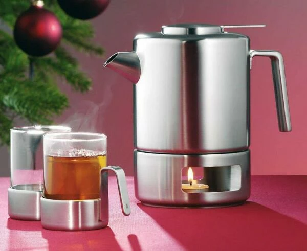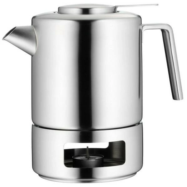 Das Tee-Set Kult Tea der Serie Kult von WMF besteht aus einem Stövchen und einer Teekanne mit Deckel und feinmaschigem Teesieb. Es ist aus mattem Cromargan® Edelstahl Rostfrei 18/10 gefertigt und bietet ein Fassungsvermögen von 1,2 Litern. Der Deckel ist fest auf der Teekanne fixiert und kann nicht herunterfallen. Natürlich lässt sich die Kanne auch ohne das Teesieb verwenden. Dank der perfekt zueinander passenden Kombination aus Stövchen und Teekanne bleibt Ihr Tee länger warm. Zum Reinigen bauen Sie die Kombination ganz einfach auseinander und spülen sie von Hand oder in der Spülmaschine.